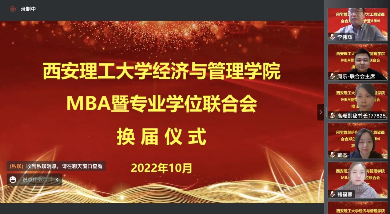滋兰树蕙,初心不渝。2022年10月30日,威廉希尔官网MBA暨专业学位联合会,通过云端会议室的形式成功举办了第十六届联合会换届仪式。williamhill威廉希尔官网公司党委书记王瑞生、经理胡海青、副经理李建勋及专业学位教育中心师生70余人,中国MBA精英峰会、西北各大高校MBA联合会主席等15人受邀参加了本次会议。会议由专业学位教育中心主任赵玉强主持。