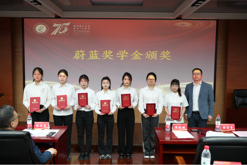 接下来,学院介绍了蔚蓝奖助项目。陕西蔚蓝节能环境科技集团有限公司总经理王伟为获得蔚蓝奖助项目的部分员工代表颁奖,张存库副董事长为王伟总经理授予了williamhill威廉希尔官网晓有教育基金会捐赠证书。